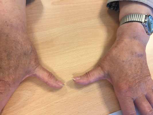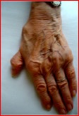 La rhizarthrose est très fréquente et de plus en plus mal tolérée surtout pendant les poussées inflammatoires douloureuses. Même si cette douleur reste localisée à la base du pouce, elle rend difficile les gestes de la vie quotidienne comme serrer une clé, ouvrir un bocal ou peler un fruit… ces douleurs peuvent devenir permanente, responsable de raideur et de gonflement. Par la suite vont apparaître des déformations avec des subluxations de la base du 1er métacarpien avec des retentissements sur la 1ère commissure en la refermant et une exploitation exagérée de la MP provoquant son extension pour aboutir à la déformation caricaturale du pouce en Z de chiffre (photo)